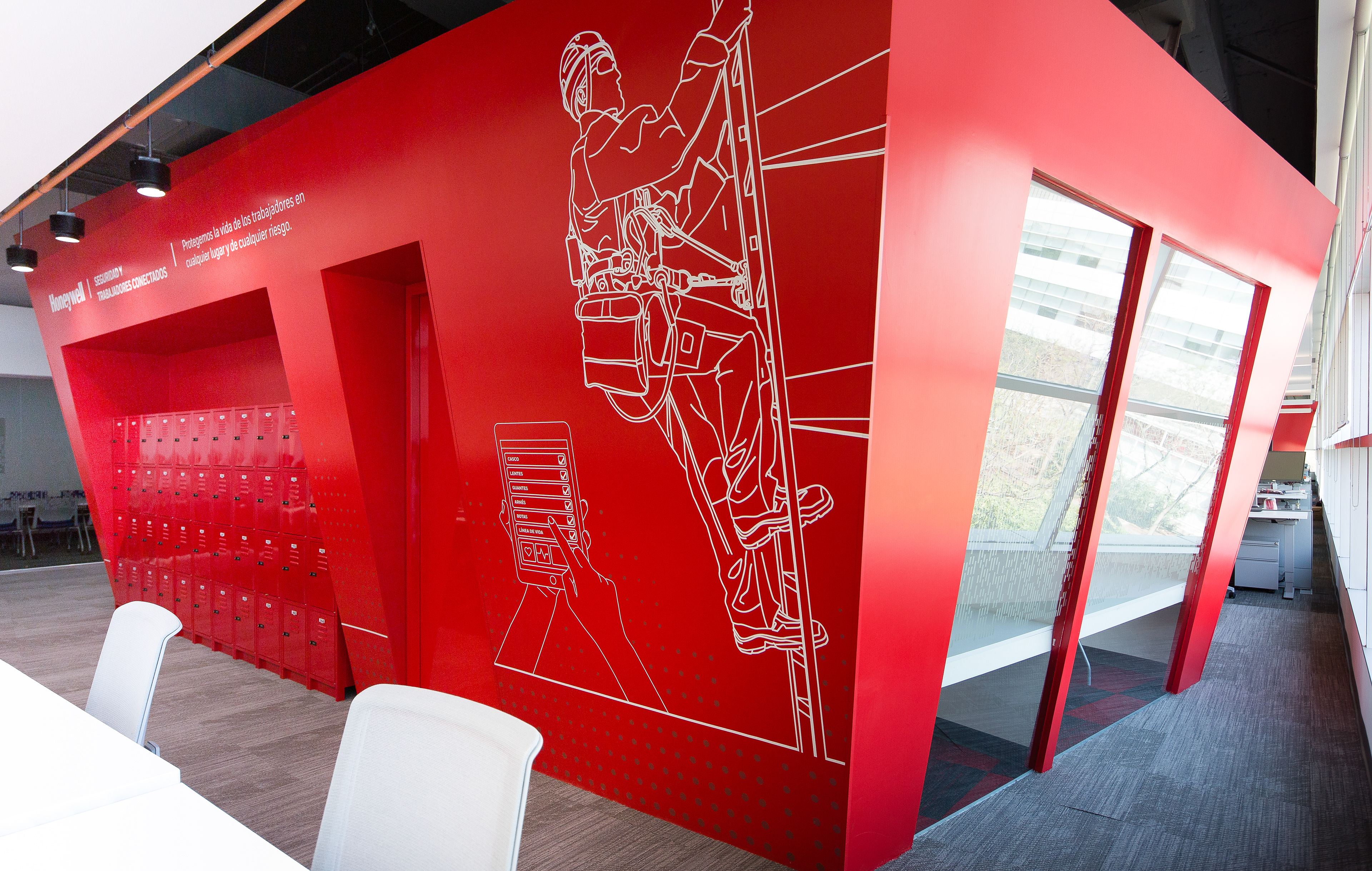 The graphics applied on the walls showcase the many applications that Honeywell’s technologies have in a wide variety of industries and scenarios, with each wall focusing on a specific business unit: Aerospace, Automotive, Safety, Fire, Retail, and Process Solutions.
